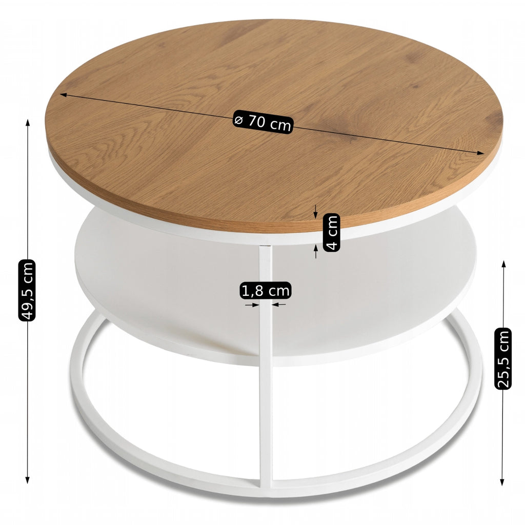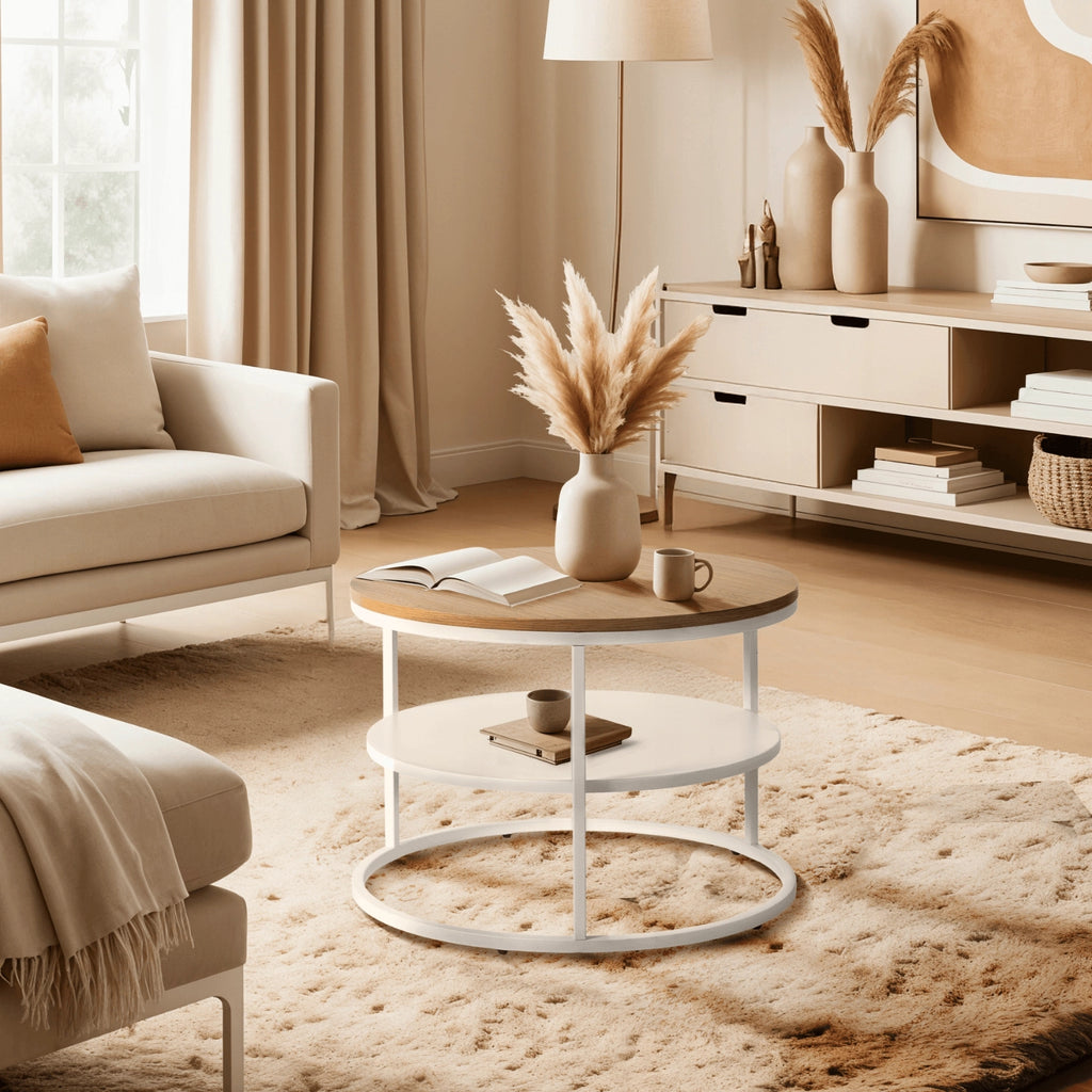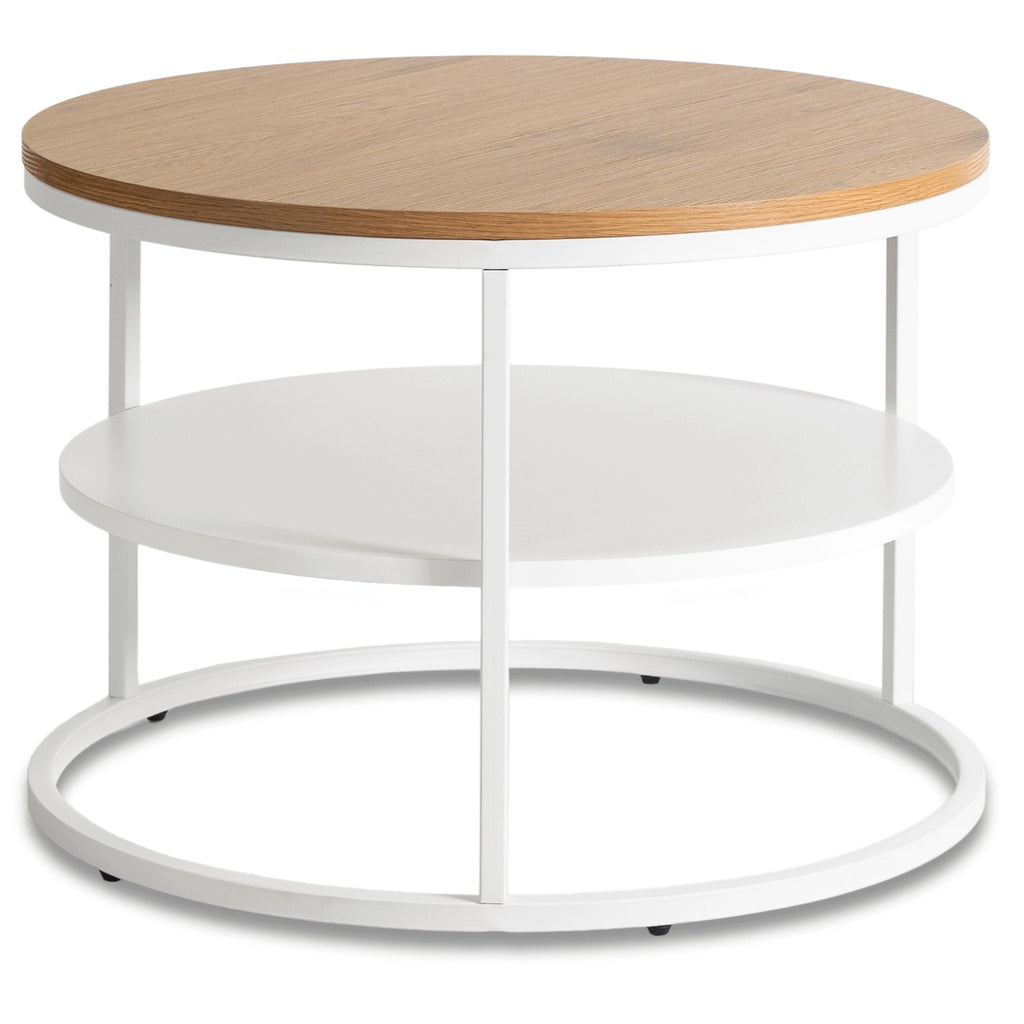 Combining a natural oak-effect MDF top with a crisp white metal frame, this round coffee table adds warmth and brightness to your interior. The convenient lower shelf offers extra storage for magazines, remotes, or decorative items, making it as practical as it is stylish.