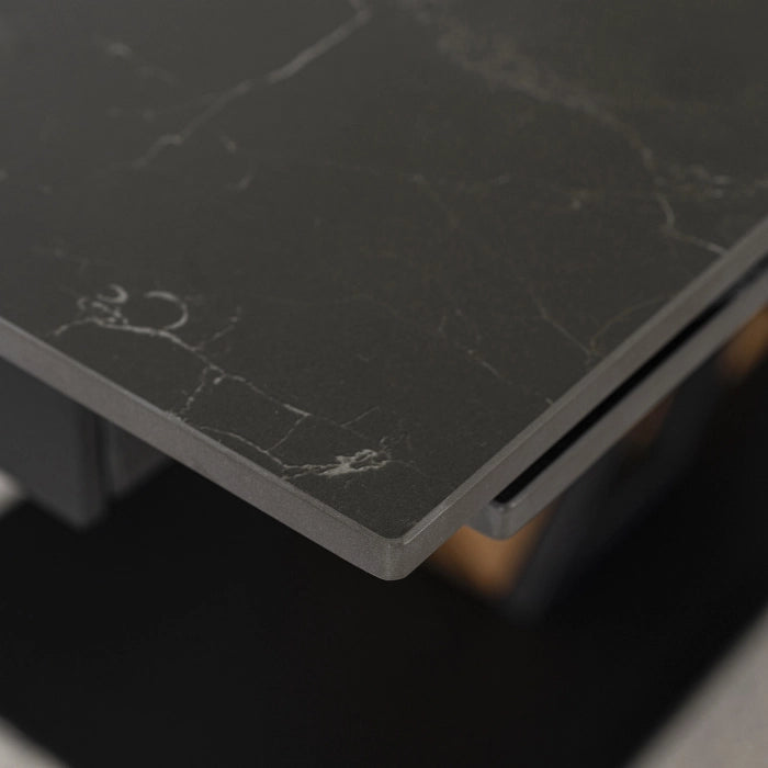 The ceramic tabletop in a black marble finish impresses with both beauty and durability. It’s resistant to scratches, heat, and stains, ensuring a flawless appearance for years to come. The sturdy base, made of black metal with a walnut accent, creates a bold, loft-style design.