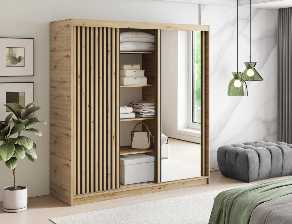 The front, featuring Artisan Oak décor with vertical slats and a mirror, adds warmth and elegance to any interior. Thanks to its timeless look, the EMERIO III wardrobe fits beautifully into Scandinavian, modern, minimalist, Japandi, and industrial spaces.