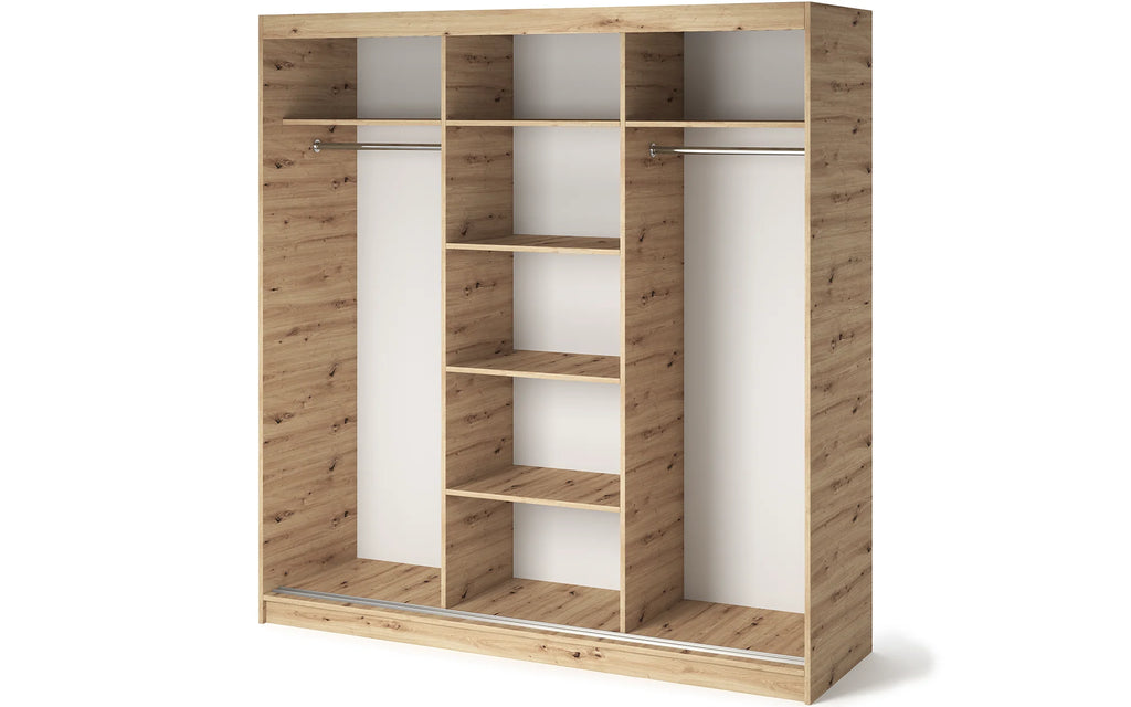 Inside, you’ll find six spacious shelves, two hanging rails, and plenty of storage for everyday essentials. The durable 16 mm laminated chipboard body is finished with ABS edging for added protection against damage. The Laguna Fast sliding system ensures smooth and quiet door movement, while low black plastic gliding feet provide stability and protect your floors.