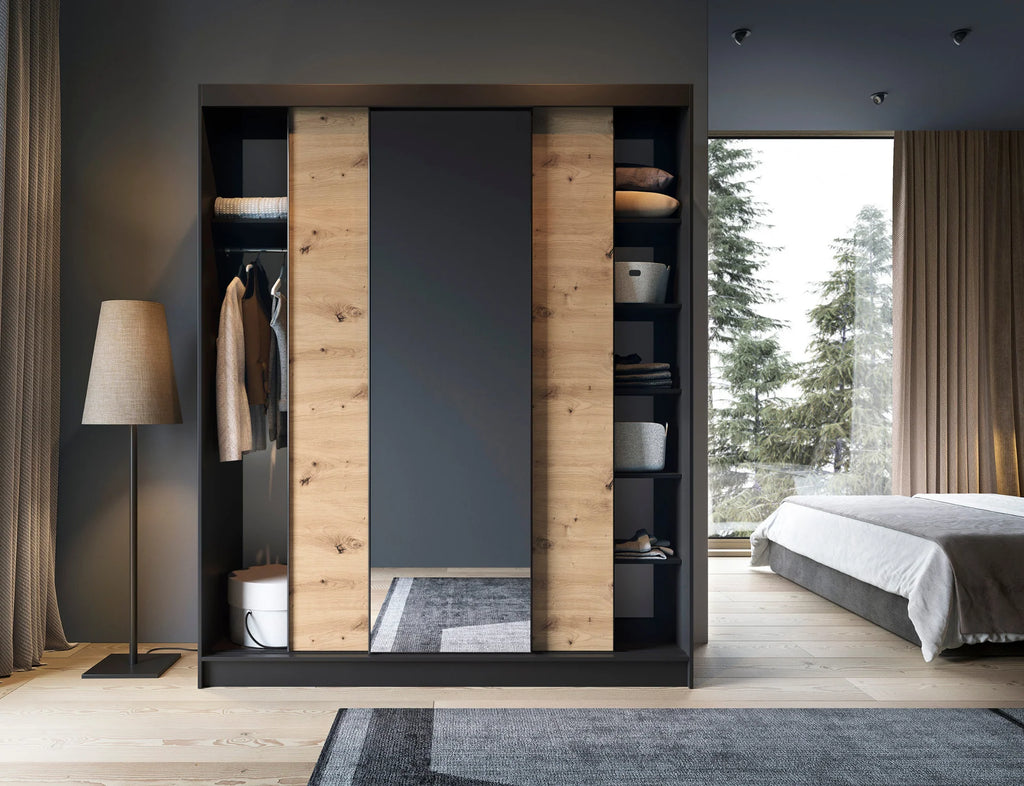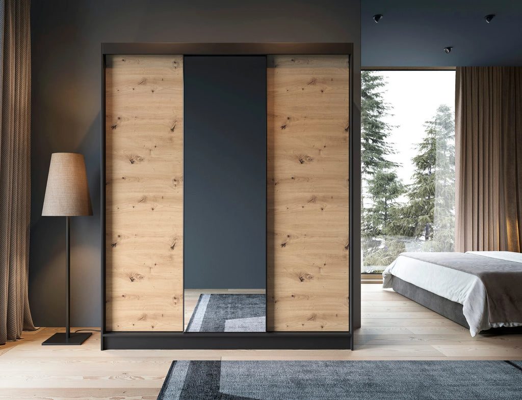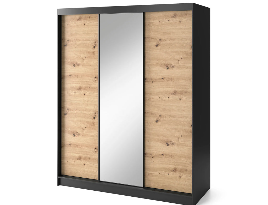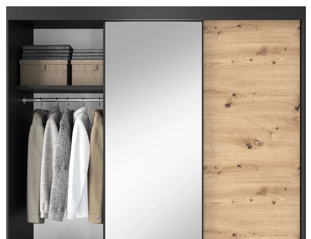 The Esville III wardrobe has been designed to merge the rugged look of industrial loft style with elegant accents. The MDF fronts, finished in Artisan Oak and matte black, give the furniture a unique appearance. The ABS edging on the fronts and body enhances durability and visual appeal, while the black plastic legs and handles perfectly complement the raw character of the piece.