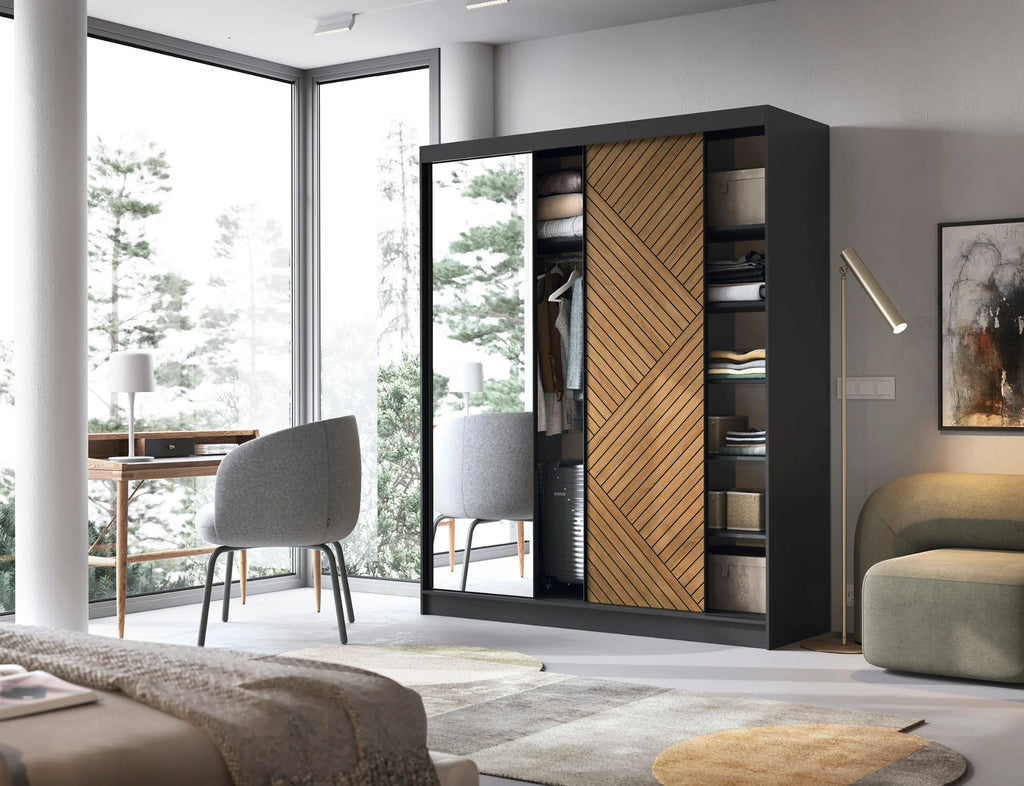 The Marrphy wardrobe combines modern elegance with practical functionality. Its three sliding doors made of laminated board in matte black with a Caramel Oak pattern and an integrated mirror create a stylish and functional centerpiece for any interior.