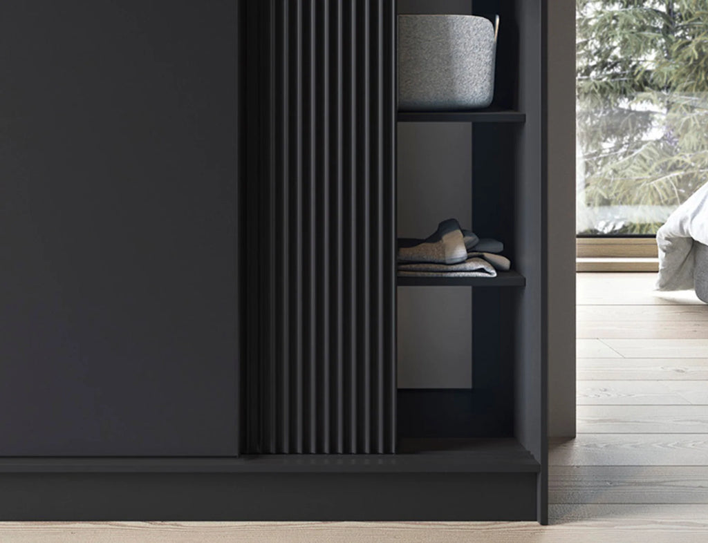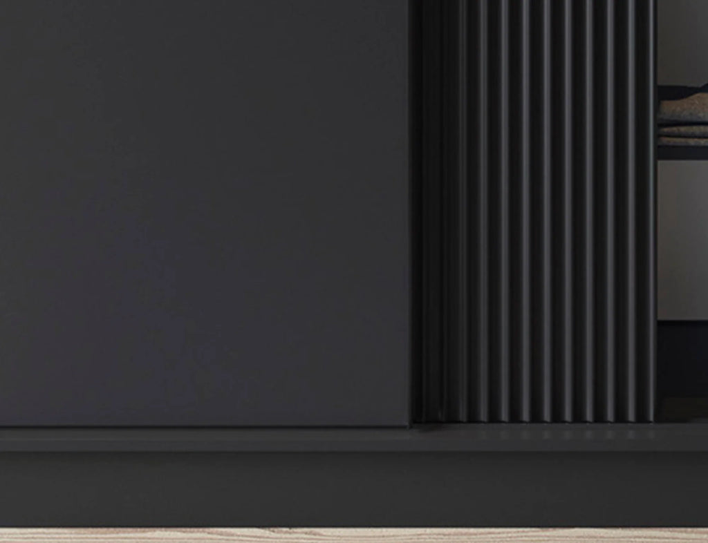 The modern Prescco sliding wardrobe combines elegance, functionality, and unique style. Its front features a contrast between smooth laminated board and ribbed MDF, creating a striking black finish with U190 Kronospan accents.