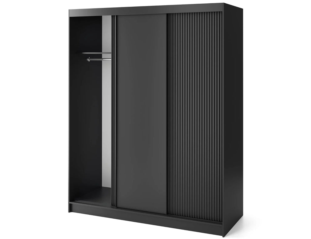 The Prescco III sliding wardrobe combines modern design, solid construction, and exceptional functionality. Finished in elegant black matte, it features a durable laminated body with ribbed MDF fronts and a smooth Laguna sliding system for silent operation. Perfect for those who value style, practicality, and premium craftsmanship in one piece of furniture.