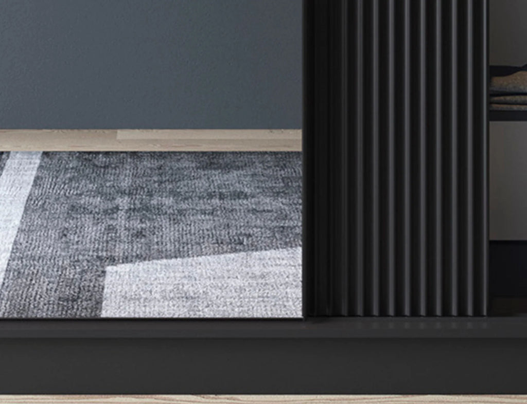 The elegant and modern Prescco wardrobe perfectly combines style and functionality. Its front features smooth laminated board, ribbed MDF, and a large mirror that visually enlarges and brightens the room. The deep U190 Kronospan black finish adds a bold and sophisticated touch.