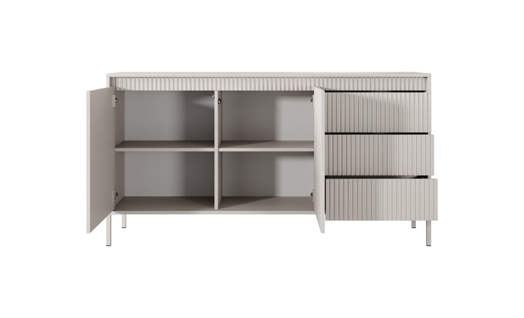 The Senso 153 cm sideboard offers versatile storage with soft, rounded aesthetics. Its beige matte finish is subtle yet refined, and handle-free access adds to its clean silhouette. Inside, drawers and shelves provide ample space for everyday items. Elevated on beige legs, it introduces modern poise and functionality into your home.