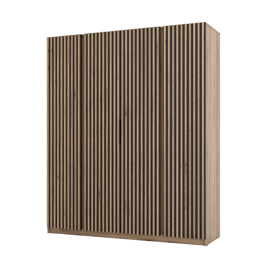The KAJA wardrobe with decorative slats is a sophisticated storage solution that blends natural warmth with modern contrast. The evoked oak carcass, combined with deep black fronts and elegant evoked oak MDF slats, creates a distinctive, contemporary look that fits perfectly into modern, loft, and Scandinavian interiors.