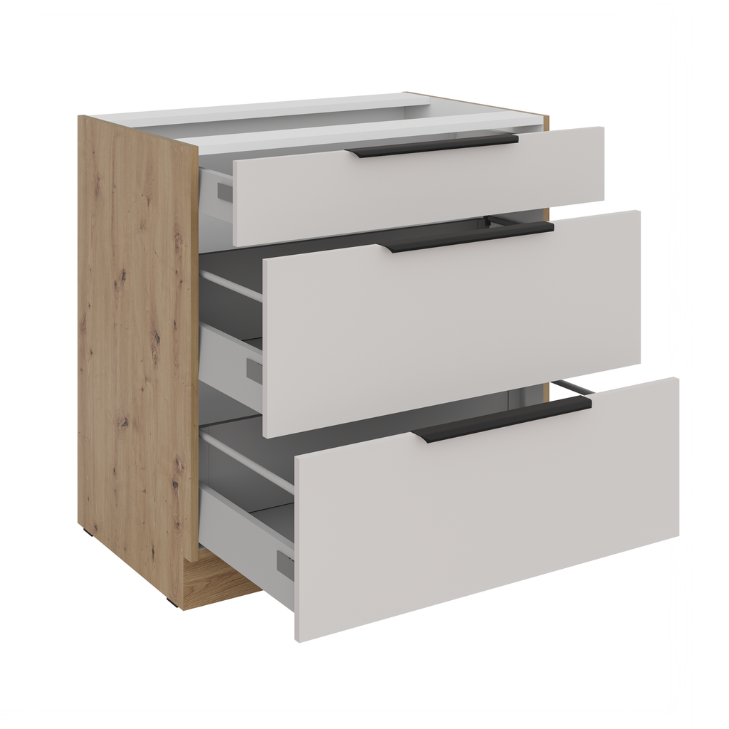 The LE Solea 80 D 3S base cabinet features three soft-close drawers for organised storage of utensils, cookware, or pantry items. Its full-extension metal drawers ensure easy access and a modern aesthetic that complements any contemporary kitchen.