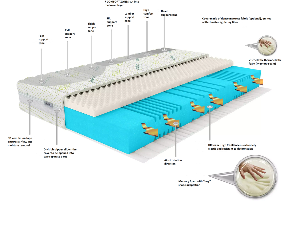 An additional 7 cm layer of Visco Memory foam (50 kg/m³), originally developed by NASA, responds to body heat and pressure, reducing pressure points and creating a feeling of lightness and relaxation. The massaging profile supports circulation and improves ventilation, preventing overheating.