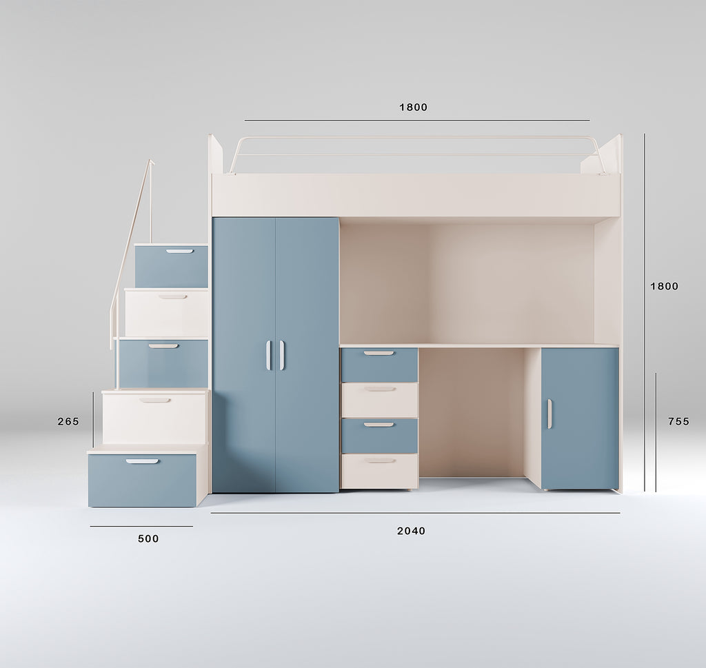 The integrated desk, spacious wardrobe, and practical stair drawers help keep the room tidy while providing safe and comfortable access to the upper bed.