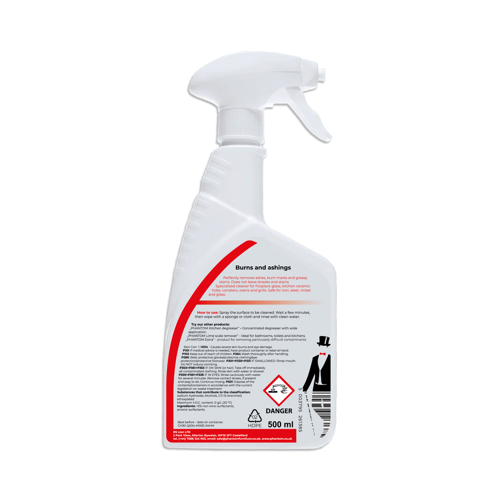 Perfectly removes ashes, burn marks and greasy stains. Does not leave streaks and stains. Specialized cleaner for fireplace glass, kitchen ceramic, hobs, canisters, oven and grills. Safe for iron, steel, nickel and glass.