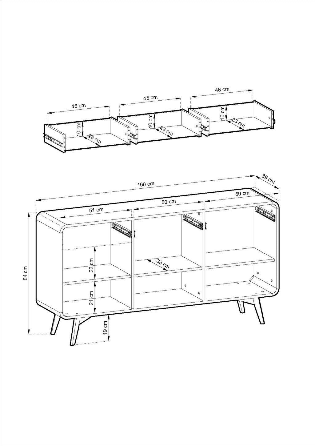 Practical layout – three drawers with a push-open system provide space for small items, while three cabinets with doors allow you to store larger accessories such as documents or textiles.