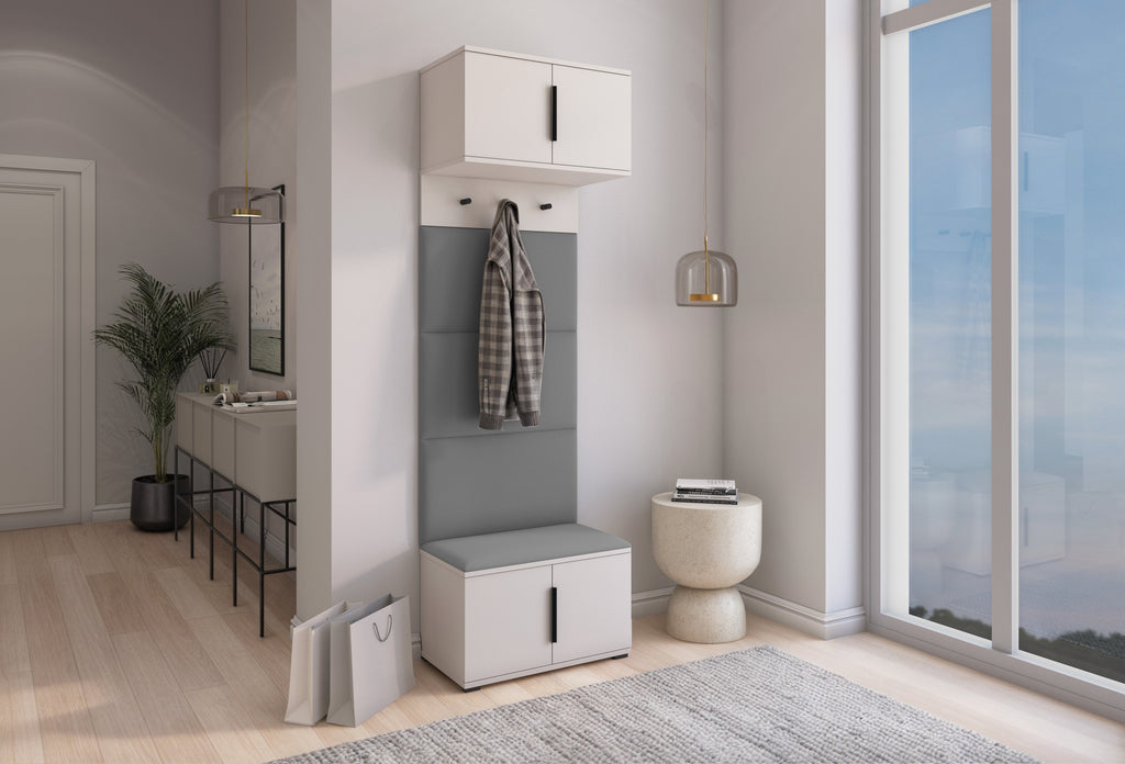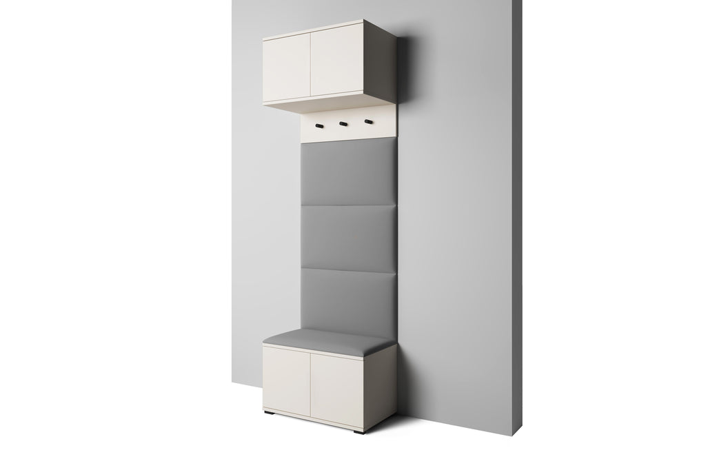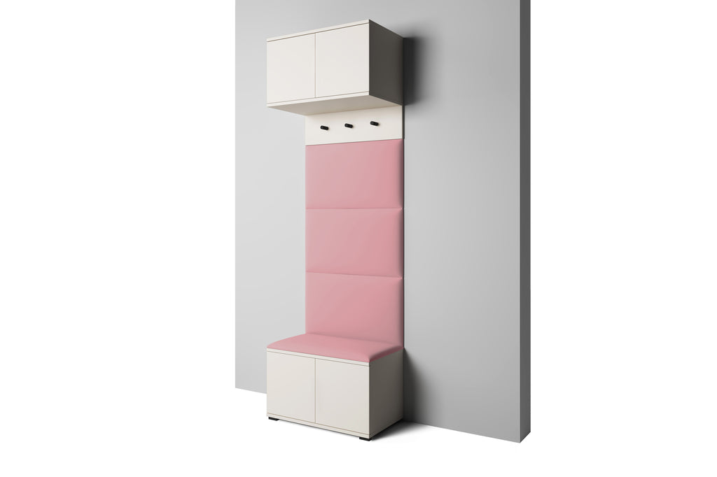 It includes four padded wall panels, a spacious shoe cabinet with a soft top for seating, a hanging section with three black metal hooks, and an overhead cupboard for extra storage. Both the overhead cabinet and shoe cabinet are equipped with a push-to-open system for a clean, handle-free look. Optional black metal handles are included and can be mounted for added contrast.