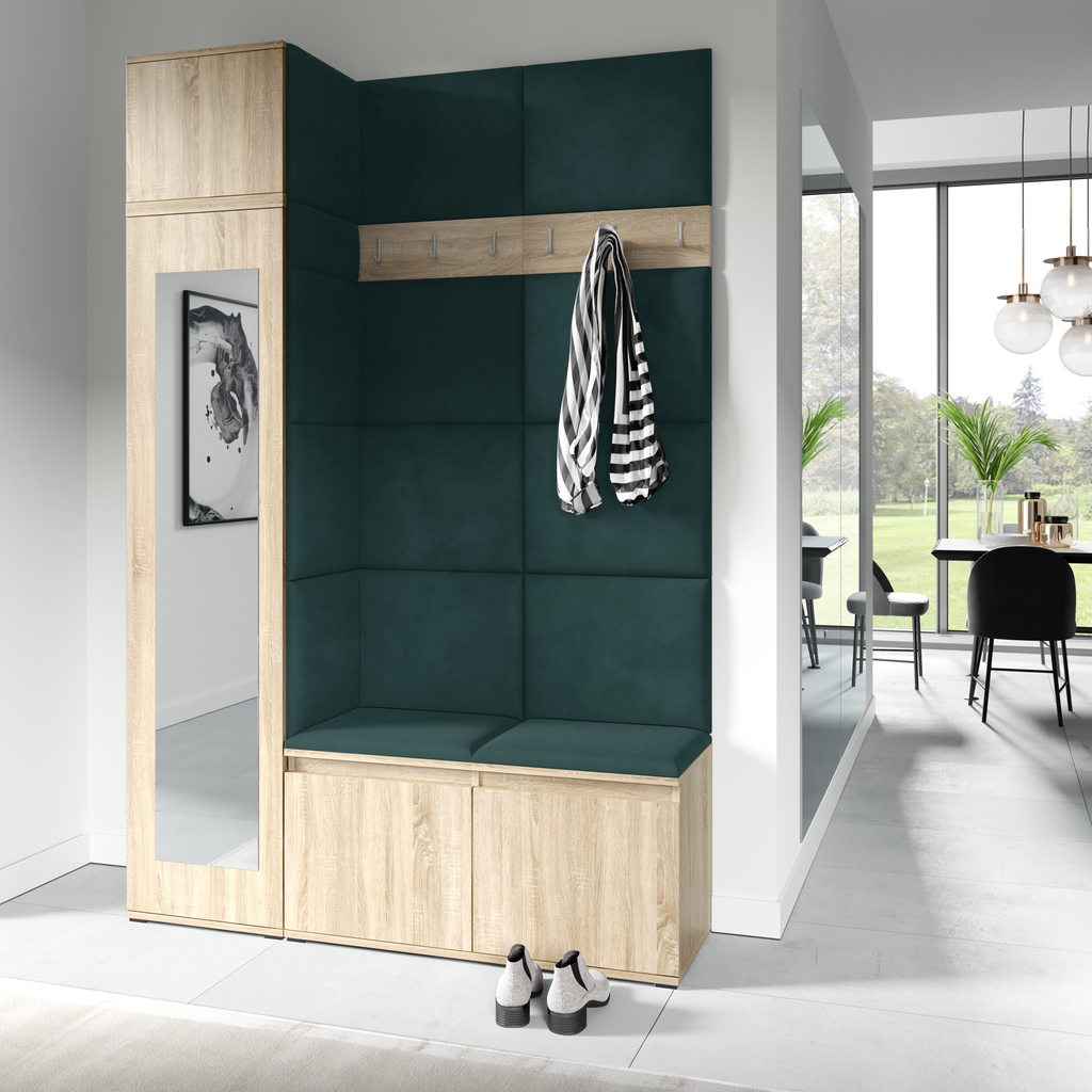 The upholstered panels give the wardrobe a unique character and enhance everyday comfort. They are mounted directly to the wall and to the wardrobe using adhesive, allowing for quick, easy, and aesthetic installation.