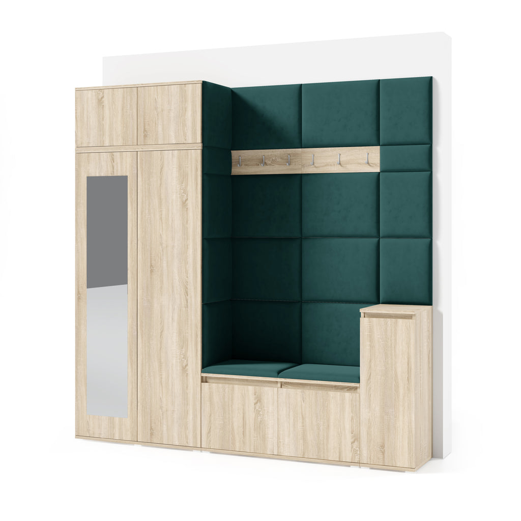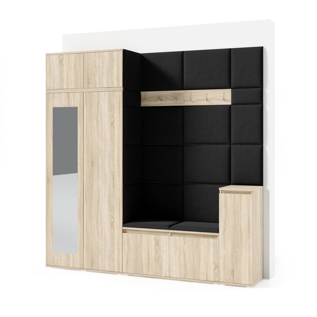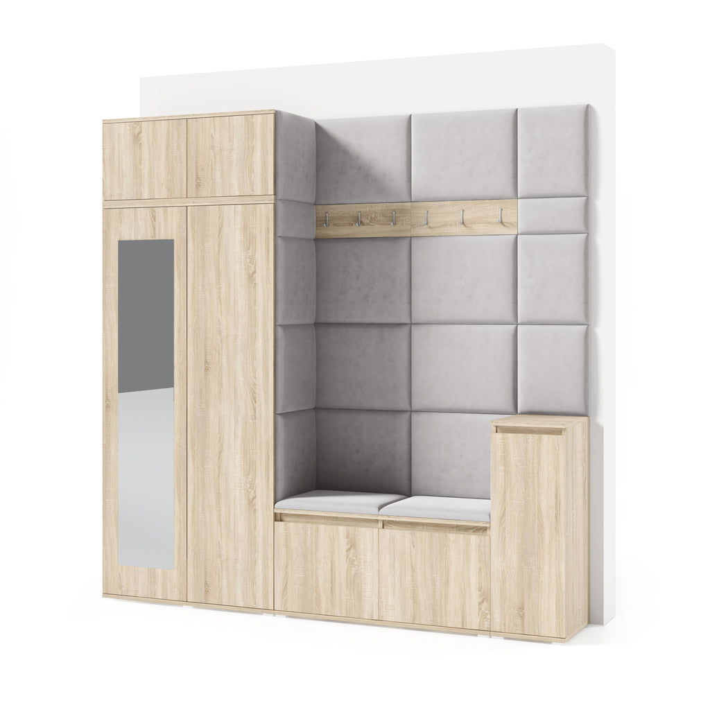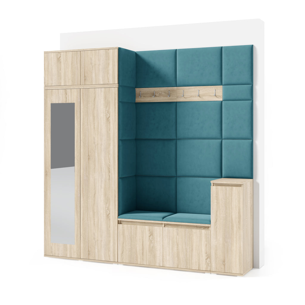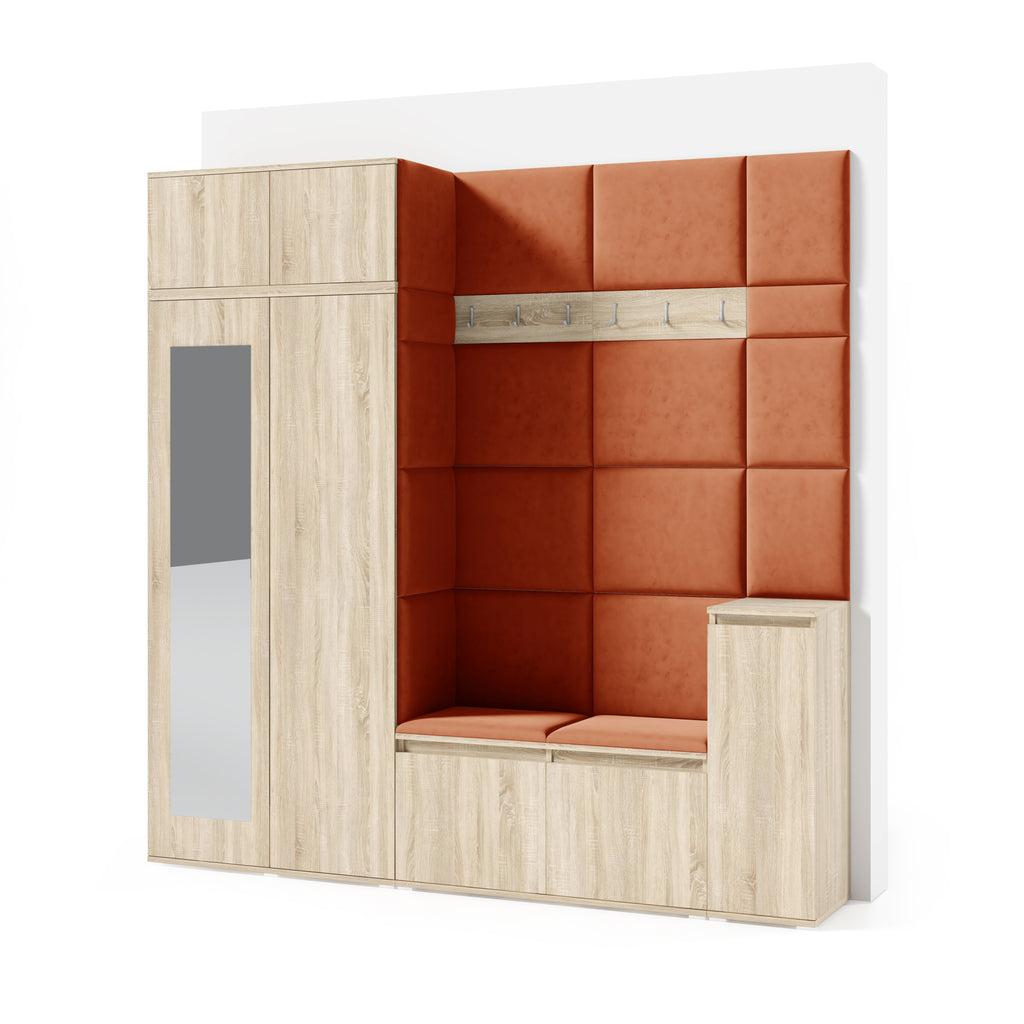 The upholstered panels give the wardrobe a unique character and enhance everyday comfort. They are mounted directly to the wall and to the wardrobe using adhesive, allowing for quick and aesthetic installation without drilling.