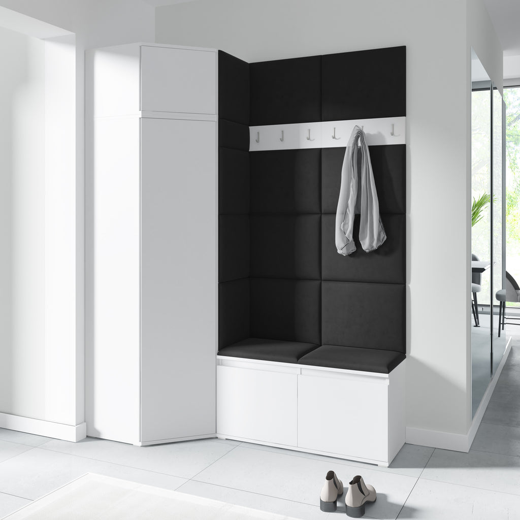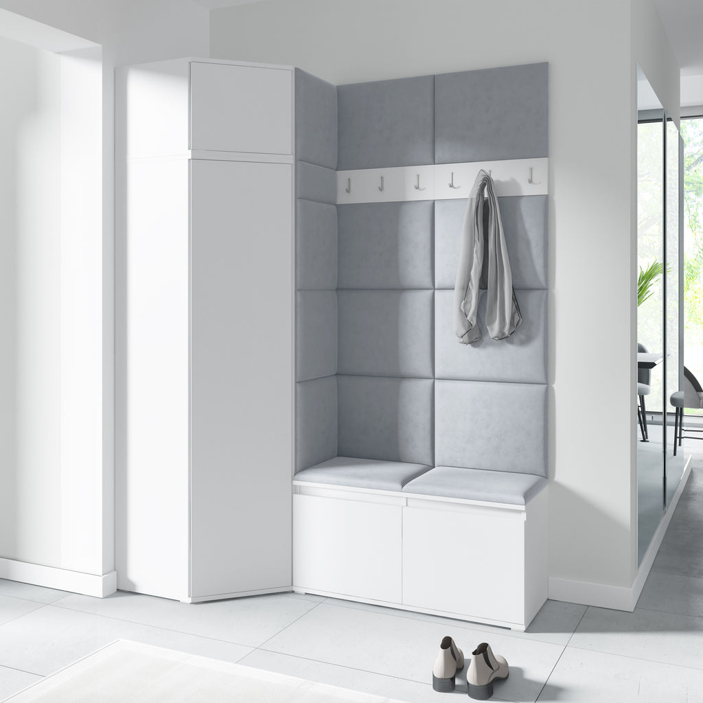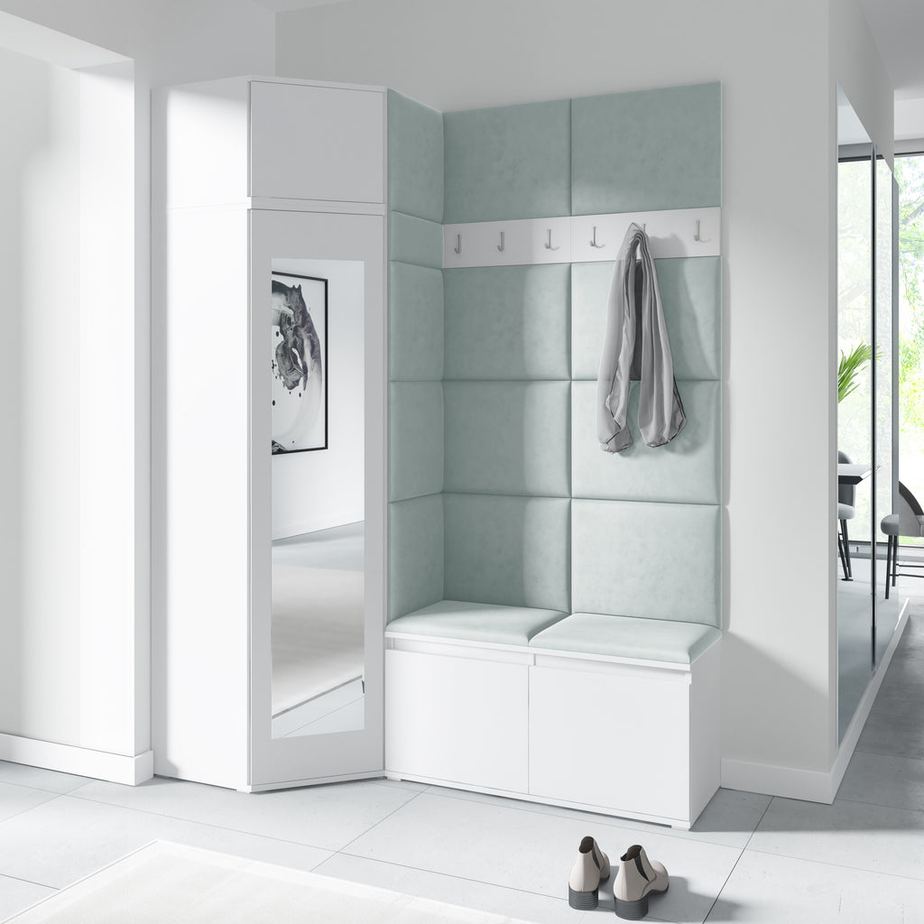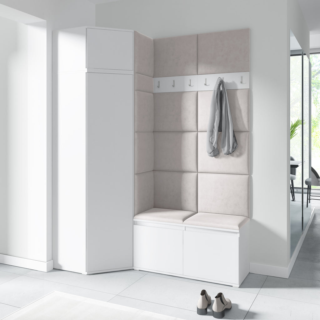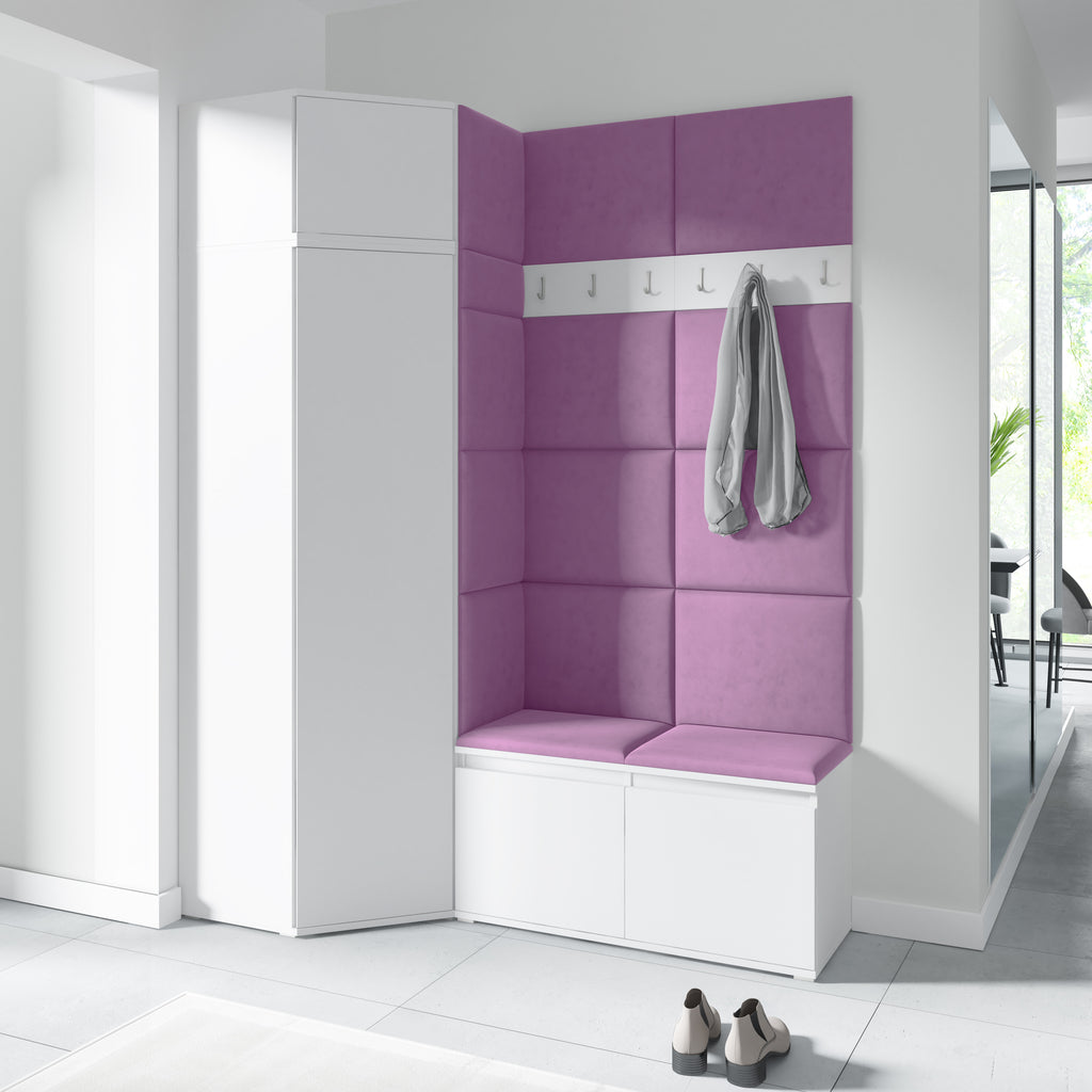 The upholstered panels are mounted directly to the wall and the wardrobe using adhesive, allowing for quick and clean installation. The soft surface of the panels increases comfort and adds a cozy, stylish touch to the interior.