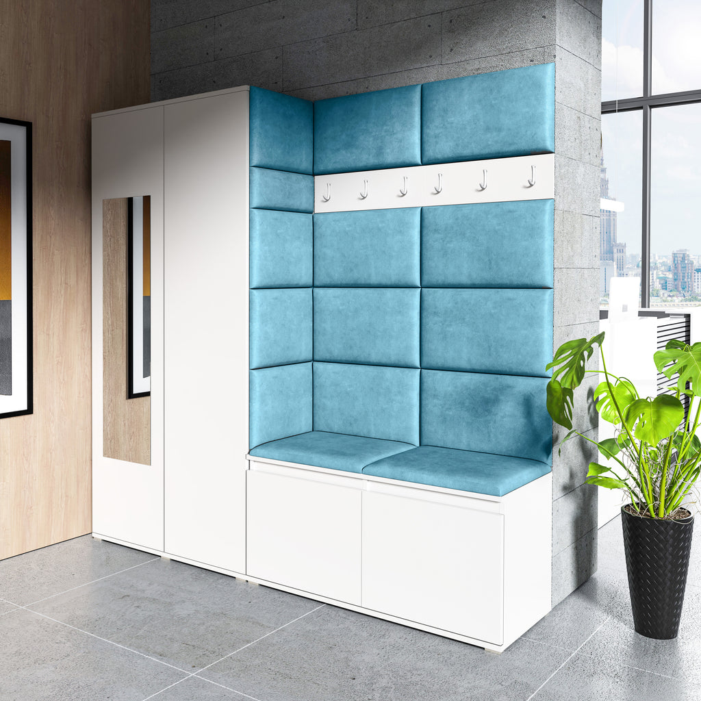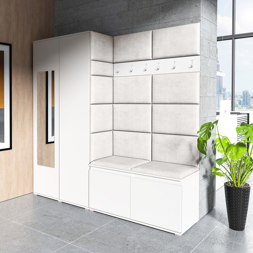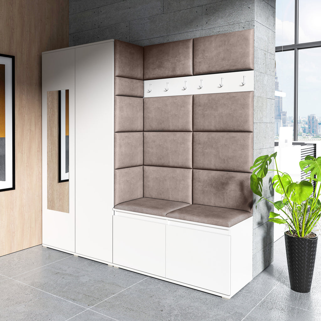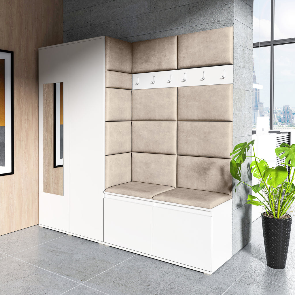 A practical and elegant solution for organising your hallway. The Emi 8 set combines generous storage space with modern design, perfect for both compact and spacious interiors. Upholstered panels provide a soft, comfortable surface while adding a stylish touch to your entrance area.