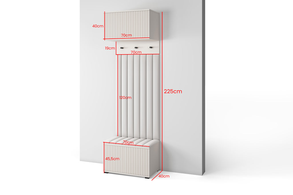 This set is perfect for contemporary interiors, offering a practical place to store shoes, hang coats, and a comfortable seat for putting footwear on. The entire unit stands on low black legs, adding lightness and a modern touch to the design.