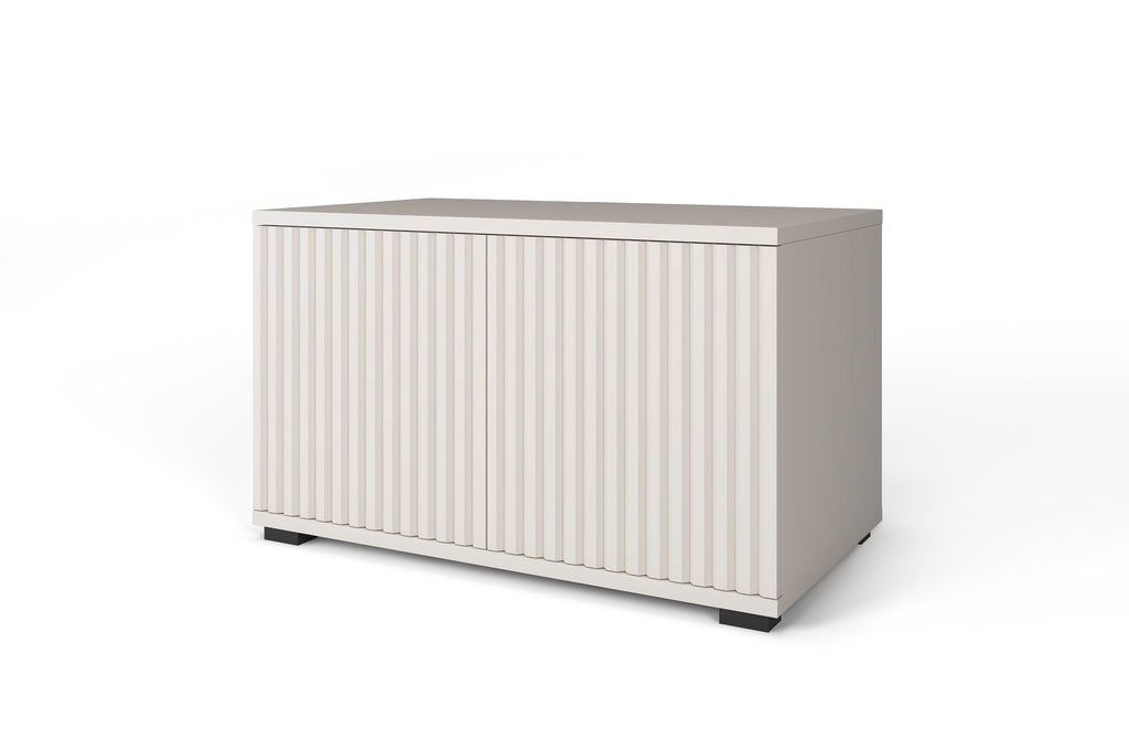 A modern hallway set in elegant Cashmere colour with milled fronts, available with or without a mirror. The design is handle-free, stands on low black legs, and is complemented by upholstered panels in Trinity fabric, creating a refined and welcoming entrance space.