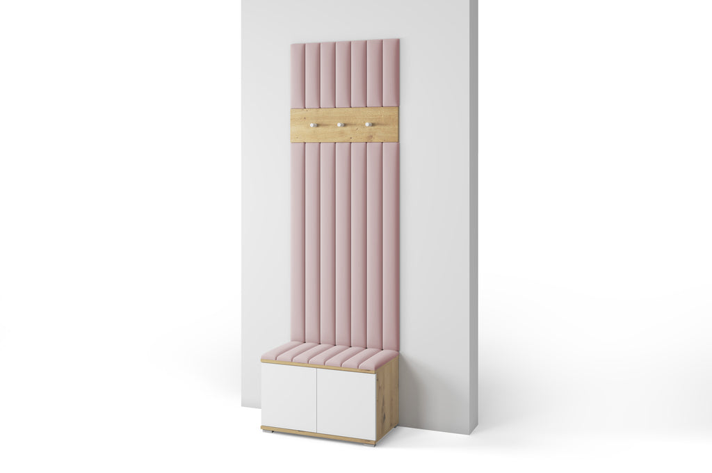 This version focuses on the essentials – a practical shoe cabinet, a clothes hanger, and a larger set of upholstered wall panels that add comfort, warmth, and a decorative accent to your entryway. It is an ideal solution for small hallways, apartments, or anyone who appreciates clean design with functional details.