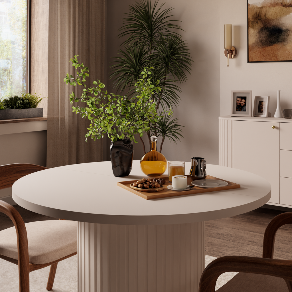 A distinctive feature of the table is its sculptural base with decorative vertical fluting, which adds a sophisticated designer character while ensuring excellent stability. The balanced proportions and carefully considered construction create a harmonious piece that combines aesthetics with everyday functionality.