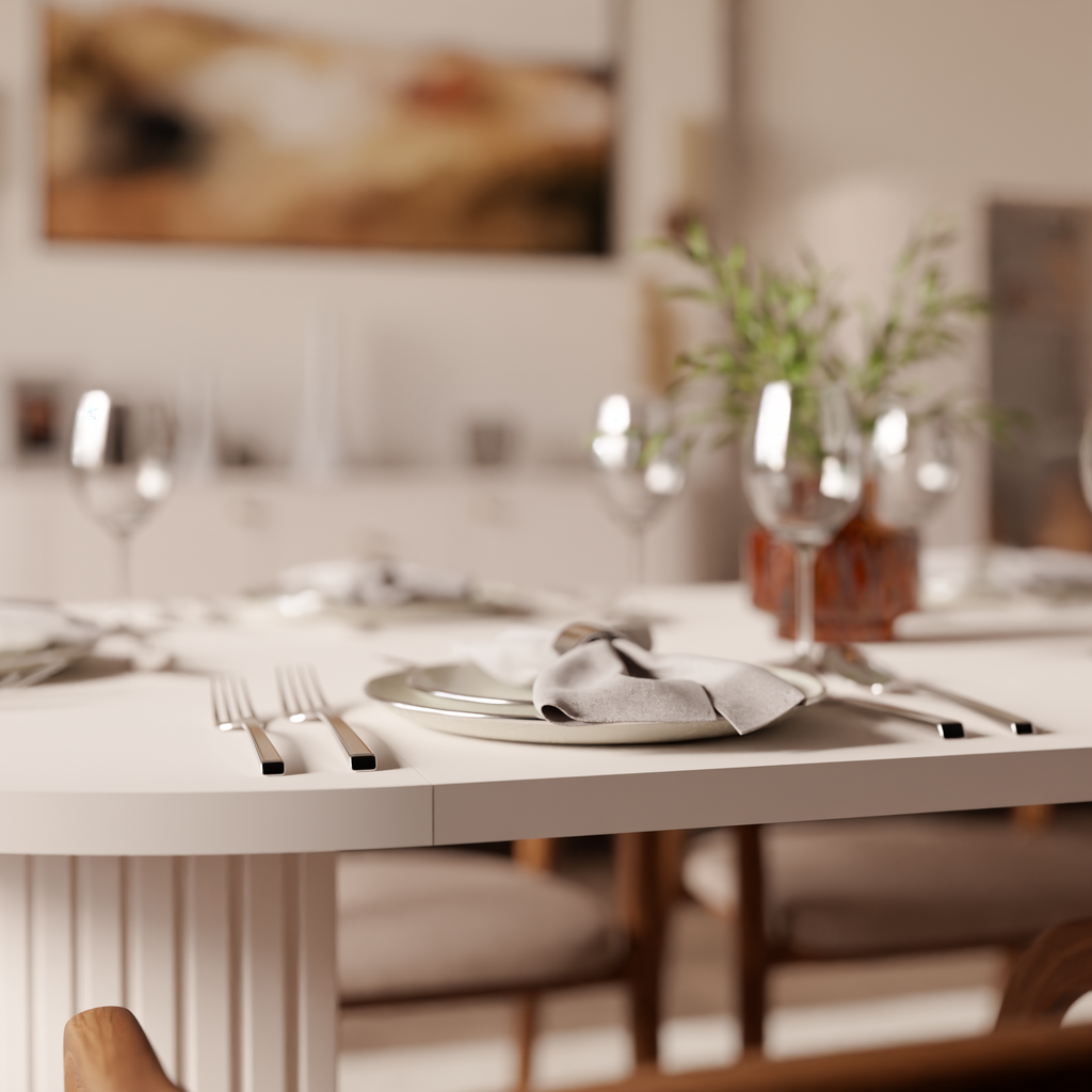 OVALIO is a modern extendable dining table with an elegant oval silhouette designed for contemporary interiors. Its smooth tabletop in a refined sand beige finish brings warmth and lightness to the space, making it a perfect fit for modern, minimalist, japandi and contemporary arrangements. The subtle color palette allows the table to blend effortlessly with a wide range of chairs and interior styles.
